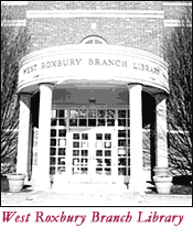 The West Roxbury Branch Library is one of the busiest libraries in Boston. It is also the home of the West Roxbury Historical Society. The Society has many artifacts and information about the history of West Roxbury. The first schoolhouse was built on this site in 1767. It was the only schoolhouse in West Roxbury for many years. Alice Hennessey and Pamela Seigle energetically worked on the committee to build an addition to the library, and Ellen McGill volunteers here.